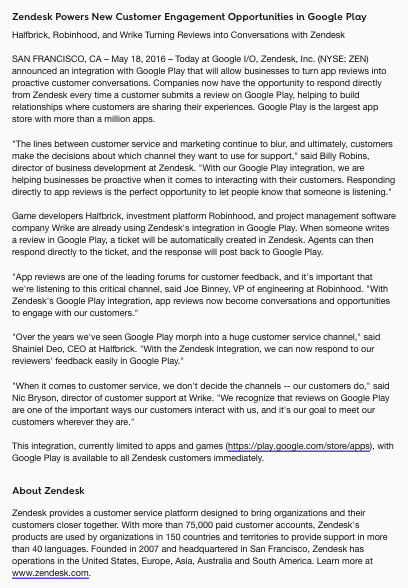 Led the launch of the Zendesk integration with Google Play at Google IO. Responsible for partner relations, PR plan, press release managing media outreach, overseeing pitching, briefings, and coordination day of event.